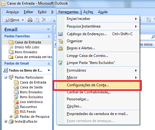 No Microsoft Outlook clique em Ferramentas > Configurações de Conta;