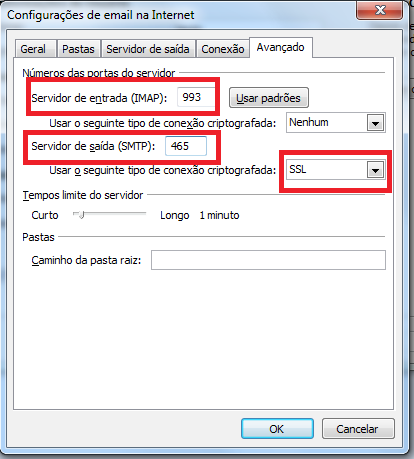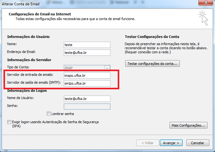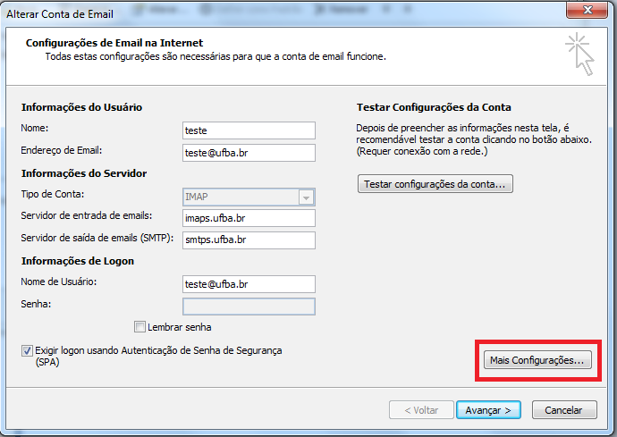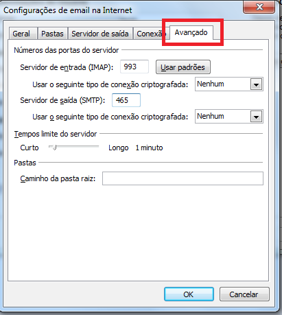 Finalizado o passo anterior, clicar na aba Avançado para configurar a porta dos servidores de saída e de entrada;