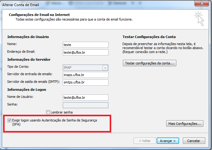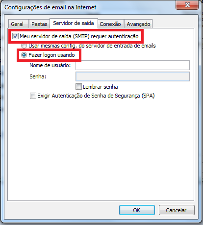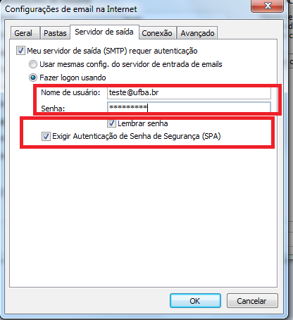 Preencher os campos de “Nome de usuário” com o e-mail do usuário e o campo da senha e marcar as opções “Exigir Autenticação de Senha de Segurança (SPA)” e “Lembrar senha”;