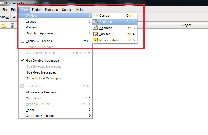 No Evolution clique em View, selecione a opção Window e a sessão que deseja exportar. Serão utilizados os contatos como exemplo
