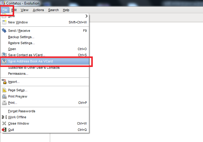 Selecionar a opção File e depois clicar em Save Address Book As VCard