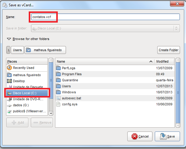 Insere o nome do arquivo que será criado com as informações dos contatos e seleciona o local onde o arquivo será salvo. Clica no botão Save