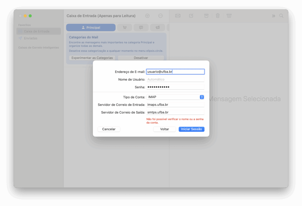 Importante: É muito comum que apareça a mensagem “Não foi possível verificar o nome ou a senha da conta.” como visto na imagem. Não se preocupe! Clique em Iniciar Sessão mesmo assim. Muitas vezes a configuração funciona.