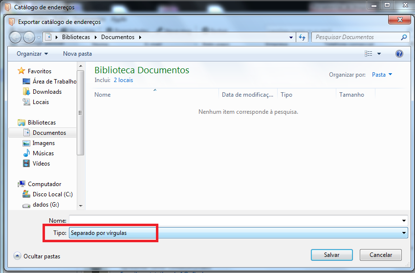 Em Tipo, escolha a opção Separado por vírgulas