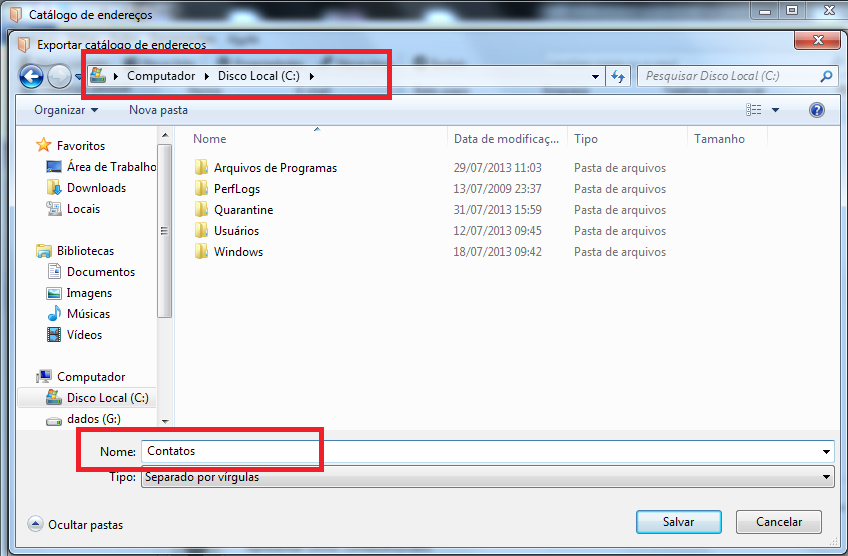 Insere o nome do arquivo que será criado com as informações dos contatos e seleciona o local onde o arquivo será salvo. Clica no botão Salvar
