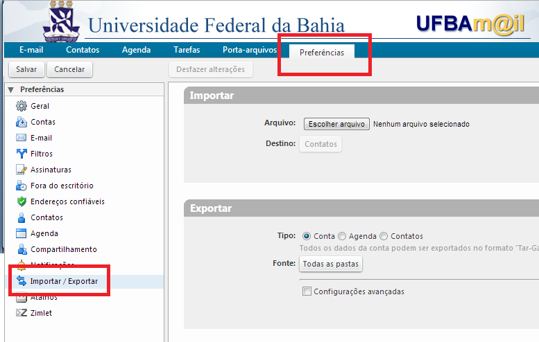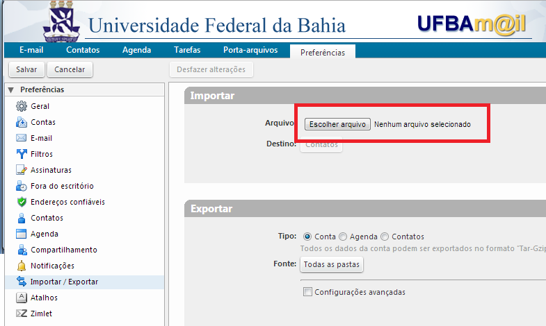 Após esses passos, acessa o mail.ufba.br, clica na aba Preferências e depois na opção Importar / Exportar, que localiza-se ao lado esquerdo da tela